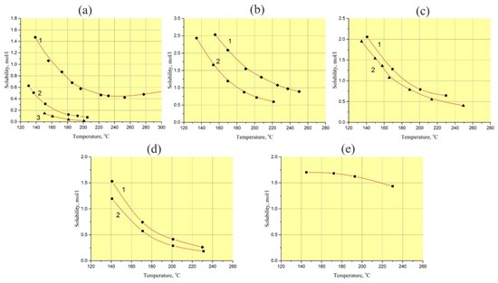 Solubility of GaPO4 in aqueous solutions (at pressure of 5–20 bar): (a) H3PO4, 1–15 M, 2–7.5 M, 3–5 M; (b) H2SO4, 1–9 M, 2– 6.5 M; (c) 15 M H3PO4/9 M H2SO4 in vol. proportions (%): 1–20/80, 2–50/50; (d) 9 M H3PO4/6 M H2SO4 in vol. proportions (%): 1–20/80, 2–70/30; (e) 6 M HCl [30].