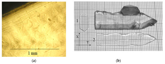 (a) Face of basal pinacoid c{0001} is represented by layer-dislocation growth mechanism, at gradients up to 15 °C; (b) GaPO4 crystal grown on ZY seed plate and plates cut from this crystal: 1—cut perpendicular to Y axis, 2—perpendicular to Z axis.