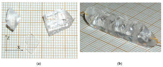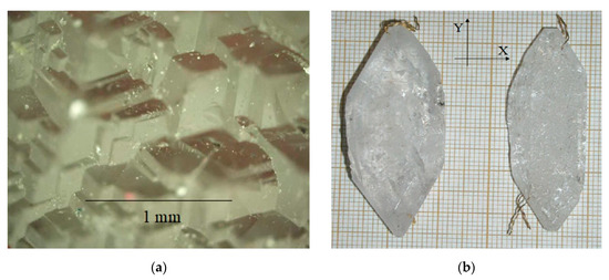 GaPO4 crystals grown on x{} seeds, (a) plate cut perpendicular to Y axis, (b) typical habit of the crystals represented by appearance of the trigonal rhombohedral faces interrupting formation of negative and positive trigonal prism faces.