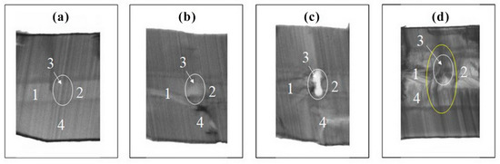 X-ray topography of cross sections of GaPO4 crystals grown on c {0001} seed plates (thickness is near to 1.5 mm) included some defects: (a) twin, (b) dislocation, (c) crack and (d) all together. 1, 2—initial seed plates; 3—defect (twin, dislocation or crack), 4—overgrown layer.