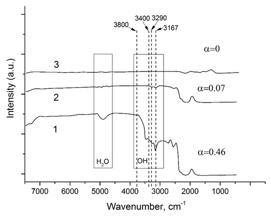 The first condition for precise determination of OH− content is a high structural homogeneity of crystals, absence of cracks and gas–liquid inclusions (mother solution impurity-free). As grown by the refluxing method, GaPO4 crystals satisfied this condition. The refluxing method applied to the growth of GaPO4 crystals showed that the solvents and T–P conditions similar to hydrothermal slow temperature gradient method allowed obtaining GaPO4 single crystals characterized by relatively low OH− content (Figure 9) (at 220–240 °C and pressure up to 20 bar). Alpha (α) value (parameter for characterization of OH− content [34,35] of the grown GaPO4 single crystals by the refluxing method does not exceed 0.5. The α values of GaPO4 crystals grown by different methods are presented in Table 2 and Figure 9.