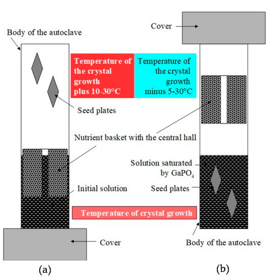 Runs sketch, saturation of the initial solution and further growth of GaPO4 crystals in the same run cycle. (a) First part of the run, autoclave is installed with the seeds on the top and nutrient– in the down; (b) second part of the run: autoclave is turned over, the seeds take a place in the saturated solution and the nutrient remains above.