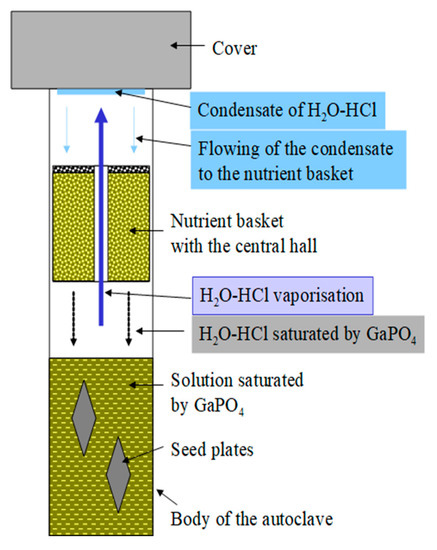 In summary, the real process of mass transport could be represented as: a mother solution in the bottom part of the autoclave, represented by “heavy” (relatively low vapor-pressure) acids as the mineralizer and a low-vapor-pressure acid as the conveyor of dissolved GaPO4 from the nutrient to the mother solution (see Figure 12).