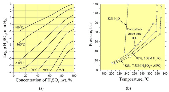 (a) Partial pressure of H2SO4 over aqueous sulfuric acid [37]; (b) pressure versus temperature at fill of 82% for H2O, 7.58 M H3PO4 and 7.58 M H3PO4 saturated with AlPO4 [38].