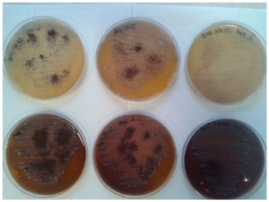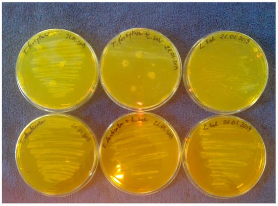 A similar effect was observed for the concentrations in the MBC test (Figure 5B). Here, in all strains, a color change in the wells was observed already at a dilution of 10−3 for the analyzed products corresponding, to an MBC value of 0.125 mg∙mL−1. The order of arrangement of the strains was identical to that in the MIC. MBC values were one the similar level than the MIC. The obtained MIC and MBC values between individual strains after treatment with the analyzed Salistat SGL03 were statistically significant.