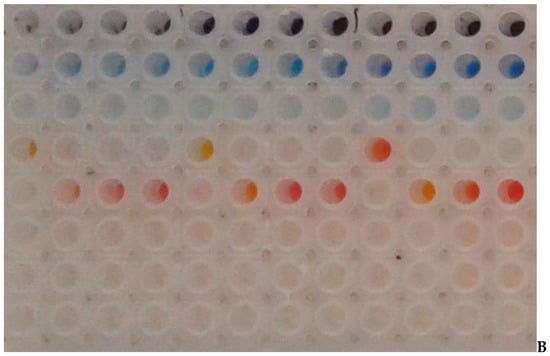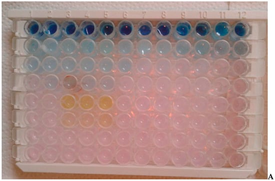 In all analyzed 96 wells (Figure 5A) from one to 12 with the bacteria of red complex a visible color change was observed after addition of Salistat SGL03. The discoloration was achieved already at dilution from 10−2 corresponding to MIC equal to 0.25 mg mL−1 to 10−4 corresponding to the MIC value of 0.0625 mg mL−1 (Figure 5) after adding of resazurin which induces microbial growth.