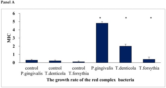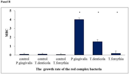Minimum inhibitory concentration (MIC) for the investigated periopathogens of the red complex (Panel A) after the application of Salistat SGL03. Minimum bactericidal concentration (MBC) for the studied red complex periopategens (Panel B) after the application of Salistat SGL03. The X axis shows the growth rate analyzed red complex strains. The Y axis represents the MIC (Panel A), (MBC) (Panel B) value in mM. Statistical significance vs. control at * p < 0.05.