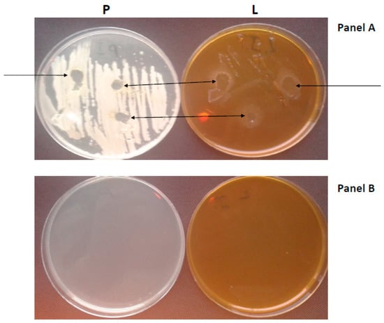An example of the effect of Salistat SGL03 on bacteria taken from the oral cavity. After 24 h of incubation (pathogens with Salistat SGL03). The zones with growth inhibition are marked with arrows. Lighter (solid) medium marked P and darker (selective) medium marked L. Material (bacterial inoculum) was taken from the oral cavity of female hygienists (female volunteers), seeded and treated in vitro with Salistat SGL03 (Panel A). Material after rinsing the mouth (in vivo) with Salistat SGL03 and spreading the bacterial inoculum on the plates (Panel B), (details in chapter 2.3 a and b—Materials and Methods and in Supplementary Materials marked as S1).