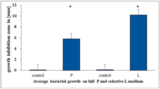 Evaluation of the inhibitory effect of the L. salivarius strain present in Salistat SGL03 on selected species of red complex bacteria living in the oral cavity after 24 h of incubation. The growth inhibition zone is expressed in (mm). P—complete medium for the growth of all microorganisms, L—selection medium for the growth of L. salivarius (for a detailed description see chapter 2.3 a and b). Statistical significance vs. control at * p < 0.05.
