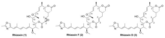 Molecular structures of rhizoxin (1), rhizoxin F (2), and rhizoxin D (3).