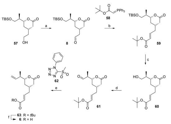The further elaboration of lactone 57 into acid building block 6 in a first stage required a two-carbon extension at the free hydroxy end that was achieved by Swern oxidation, to yield aldehyde 8, followed by Wittig olefination with stabilized ylide 58 (Scheme 9). Ester 59 was obtained as a single isomer in 79% overall yield from 57. In contrast to the Wittig reaction with ylide 58, the HWE reaction of aldehyde 8 with the tbutyl diethylphosphonoacetate gave ester 59 in much lower and highly variable yields. After installation of the carboxy functionality, completion of the carbon framework of acid building block 6 required the elaboration of the terminal double bond at the non-carboxy end of the structure. To this end, the TBS-ether moiety in 59 was cleaved with buffered (AcOH) TBAF, to afford alcohol 60 in excellent yield (provided that the acid present was not neutralized with NaHCO3 during work-up). After Dess-Martin oxidation [31], aldehyde 61 was isolated as a crude product after simple extractive work-up, as significant racemization on silica gel precluded chromatographic purification. Surprisingly, the conversion of the carbonyl group into the terminal double bond proved to be highly challenging. Thus, Wittig methylenation with MePPh3Br/KHMDS was accompanied by epimerization of the α-stereocenter and the desired olefin was only obtained in 8% yield. A whole series of alternative methods for double bond formation were then investigated, including Tebbe [55], Takai [56], Oshima-Lombardo [57], Julia [58], as well as Rh- [59] and Cu-catalyzed [60] methylenations; of these, only the Julia olefination of 61 with the phenyltetrazol sulfone 62 gave the desired olefin 63 in a preparatively useful yield of 38% (based on alcohol 60); but the compound could only be isolated as a mixture with residual sulfone 62. The latter was readily removed after tbutyl ester cleavage with TFA, which gave the desired acid 6 in quantitative yield.