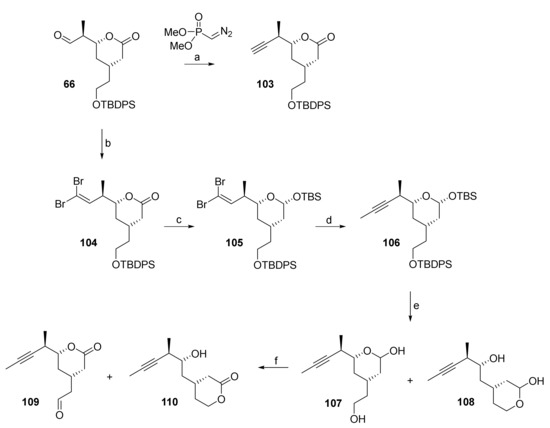 - Hickmann, V.; Alcarazo, M.; Fürstner, A. Protecting-Group-Free and Catalysis-Based Total Synthesis of the Ecklonialactones. J. Am. Chem. Soc. 2010, 132, 11042–11044. [Google Scholar] [CrossRef]