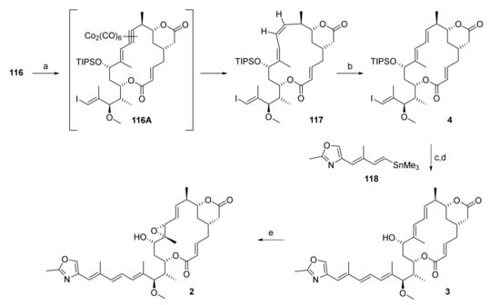 - Karier, P.; Ungeheuer, F.; Ahlers, A.; Anderl, F.; Wille, C.; Fürstner, A. Metathesis at an Implausible Site: A Formal Total Synthesis of Rhizoxin D. Angew. Chem. Int. Ed. 2018, 58, 248–253. [Google Scholar] [CrossRef] [PubMed]