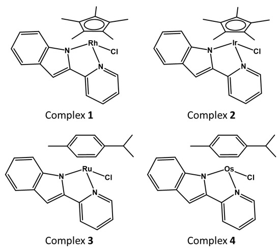 Complexes 1–4 were prepared by stirring corresponding metal dimers with the ligand 2-(2-pyridinyl)-1H-indole (ind-py) in dry dichloromethane at ambient temperature and in the presence of triethylamine. All complexes were characterised using 1H and 13C-NMR spectroscopy (Figures S2–S9), and high-resolution ESI-MS (Figures S10–S13).