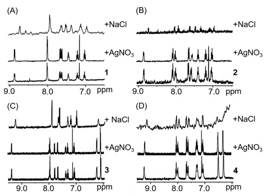 1H-NMR spectra of complexes 1–4 (A–D, respectively) in the presence of silver nitrate or sodium chloride, (1.1 mM complex, MeOD/D2O 1:1 v/v, pH 7.4, 298 K). Weak signals and low signal-to-noise ratios are due to the precipitation of the neutral chlorine complex adduct after addition of chlorine.