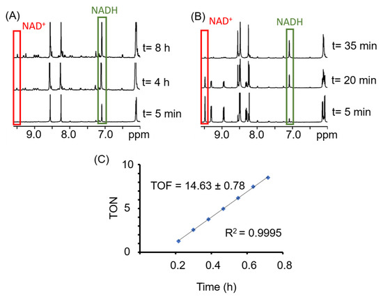 Molar ratios of NAD+ and NADH were determined by integrating the area under the signals associated with NAD+ (9.33 ppm) and 1,4-NADH (6.96 ppm). The turnover number (TON) for the reaction was calculated as follows:
