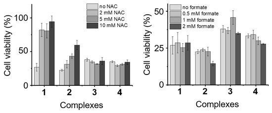 Cell viability of A2780 cells treated with complexes 1–4 in combination with NAC (Left) or sodium formate (Right).