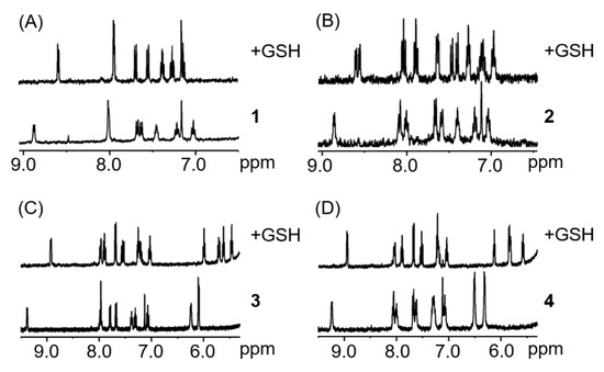 To try to rationalise the discrepancy between the TOF calculations and the absence of effect in cells, we investigated the influence of glutathione (GSH) on the catalytic properties of complexes. GSH is a well-known detoxifying agent and ROS scavenger that is found in millimolar concentrations within the cell [78,79]. For example, it has been demonstrated that cisplatin-GSH adducts are easily formed, hampering the binding of cisplatin with DNA and contributing to the excretion of the drug from cells [80,81]. Similarly, half-sandwich complexes of ruthenium, osmium, iridium or rhodium have been reported to tightly bind to GSH, inhibiting any possible reaction with either DNA, NADH or other targets [82,83,84]. The interaction of complexes 1–4 with two equivalents of GSH was studied (1.1 mM complex, MeOD/D2O 1:1 v/v, pH 7.4, 298 K; Figure 5). 1H-NMR spectra of complexes 1, 3 and 4 show only one set of signals, which can be attributed to the formation of the GSH adduct. Furthermore, the formation of glutathione adducts occurred within minutes, which demonstrates the high affinity of these complexes to bind to the tripeptide. Complex 2 was also shown to react within minutes after the addition of GSH, however two species can be observed in less than 10 min. Both species can be attributed to the reaction of the complex with GSH although the structure of the adduct could not be determined.