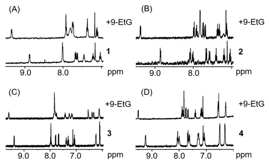 Since DNA is a known potential target for transition metals complexes [62,85], compounds 1–4 were reacted with two molar equivalents of 9-ethylguanine (9-EtG) and 9-methyladenine (9-MetA) in aqueous solution at pH 7.4 ± 0.2. All the complexes were shown to react with 9-EtG, with a full conversion within minutes. In MeOD/D2O (1:1 v/v), the H8 resonance of the 9-EtG (7.82 ppm under these conditions) can be seen to shift upfield by 1.3 ppm. Interestingly, from the 1H-NMR spectra of the complexes with 9-MetA (Figure 6), it can be observed that no reaction between the metal complexes and the nucleobase occurs. This demonstrates a more selective behaviour of the compounds hereby described compared to platinum drugs, which bind both to adenine and guanine [86].