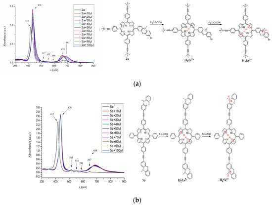 - Rudine, A.B.; Delfatti, B.D.; Wamser, C.C. Spectroscopy of Protonated Tetraphenylporphyrins with Amino/Carbomethoxy Substituents: Hyperporphyrin Effects and Evidence for a Monoprotonated Porphyrin. J. Org. Chem. 2013, 78, 6040–6049. [Google Scholar] [CrossRef] [PubMed]