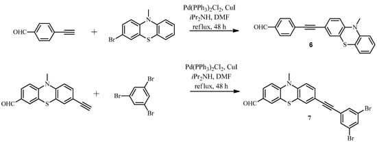 - Kramer, C.S.; Muller, T.J.J. Synthesis and Electronic Properties of Alkynylated Phenothiazines. Eur. J. Org. Chem. 2003, 18, 3534–3548. [Google Scholar] [CrossRef]