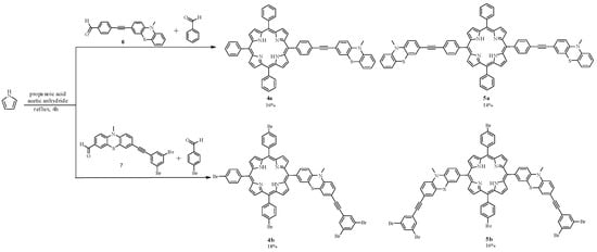 - Qiu, X.; Lu, R.; Zhou, H.; Zhang, X.; Xu, T.; Liu, X.; Zhao, Y. Synthesis of Phenothiazine-Functionalized Porphyrins with High Fluorescent Quantum Yields. Tetrahedron Lett. 2008, 49, 7446–7449. [Google Scholar] [CrossRef]
