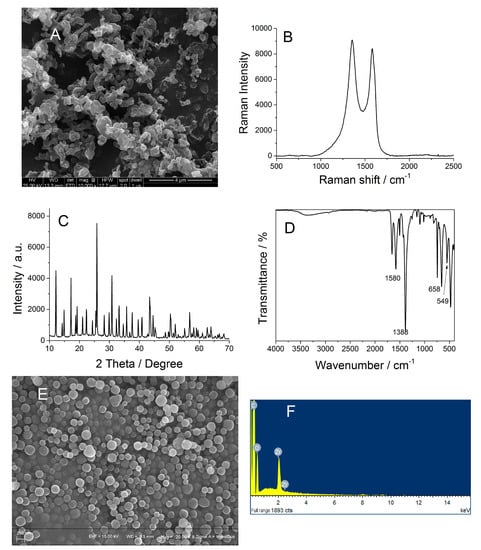 The SEM image and Raman spectrum of rGO are shown in Figure 1. The small pieces and sheet-like structure, as well as the agglomeration of rGO can be found in Figure 1A. In the Raman spectrum of rGO, two apparent Raman peaks could be observed at 1352 and 1580 cm−1 which could be assigned as the D and G bands of rGO, respectively, (Figure 1B) [21].