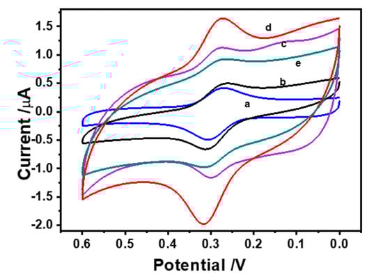 The electrochemical behavior of LU (0.5 μM) in phosphate buffer saline (PBS, pH = 6.0) on the different kinds of modified electrodes was evaluated by CV. Figure 3 indicated that five kinds of electrodes had varying degrees of redox reactions and different extents of signal of LU. The highest oxidation peak current (Ipa) was obtained on UiO-66/ErGO/GCE, which proved that the modifications of UiO-66 and ErGO made contributions to the signal enhancement of the electrode. As one of the modified materials, UiO-66 showed enrichment and molecular recognition abilities, which increased the binding between LU and the electrode surface [28]. However, the limitations of UiO-66 in conductivity was made up for by ErGO, which possessed high superficial area, high speed of electron transfer and strengthened electrochemical signals. It can be observed in Figure 3d that a simultaneous increase of the anodic and cathodic processes suggested an increase of superficial area on the surface of electrode caused by the modifications of ErGO and UiO-66. It could be assumed that the synergy of ErGO and UiO-66 led to the rise of Ipa by expanding the effective electrode area and accelerating the electrochemical reactions.