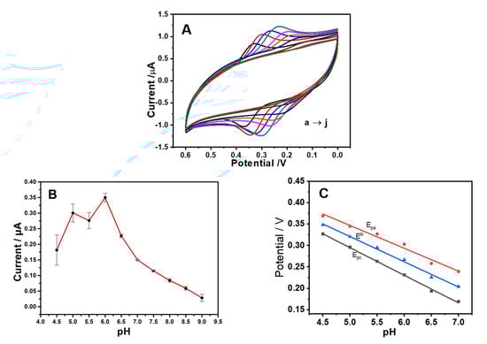 The electrochemical behavior of UiO-66/ErGO/GCE for LU with different pH was evaluated by CV (Figure 4A). As shown in Figure 4B, the Ipa was affected obviously when the acidity of the buffer solution changed. The Ipa reached the maximum value when the pH value was 6.0. Therefore, PBS under this condition (pH 6.0) was selected as the electrolyte solution for detecting LU. When the pH value was less than 6.0, the Ipa of the electrode fluctuated slightly. While the Ipa showed a downward trend when the pH value exceeded this value, it might be because the reduction of proton content made the reaction more and more difficult. On the other hand, the Epa gradually shifted to negative potential as the pH value increased, which also proved that protons were part of this reaction. As shown in Figure 4C, there was a linear relationship between Epc, Epa, EƟ and pH shown as: Epc = −0.0646 pH + 0.6181 (R2 = 0.9979), Epa = −0.0534 pH + 0.6140 (R2 = 0.9764) and EƟ = −0.0590 pH + 0.6161 (R2 = 0.9939). These trends were precisely the same as the theoretical value of the Nernst Equation. In other words, the number of transferred electrons and protons was exactly the same as those in the electro-oxidation reaction of LU, which followed a two-electron and two-proton mechanism [29].