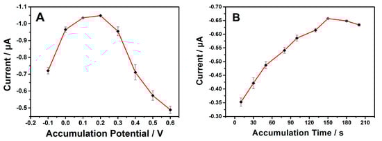 Relationship between peak current of LU and (A) accumulation potential and (B) accumulation time.