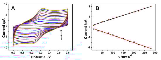 The effect of scan rate (0.01 to 0.275 V s−1) on the peak current of LU was performed in detecting 0.5 μM of LU in PBS (pH = 6.0). As shown in Figure 6, there were linear relationships between Ipa, Ipc and scan rate. The linear regression Equations were described as follows: Ipa = 6.6399 v + 0.1563 (R2 = 0.9968) and Ipc = −7.1546v − 0.0974 (R2 = 0.9949). The above results illustrated that the reaction of LU on the surface of UiO-66/ErGO/GCE was controlled by the adsorption procedure [30].