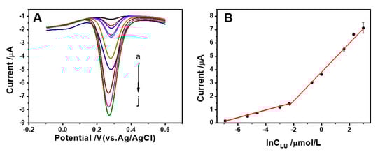 Under the optimization conditions discussed above, differential pulse voltammetry (DPV) was used to complete the electrochemical responses for different concentrations of LU. It could be seen in Figure 7, the Ipa of LU gradually increased with continuously increasing concentration, and there were two different linear relationships at high and low concentrations between Ipa and lnCLU. At low concentrations of LU (0.001, 0.005, 0.01 and 0.05 μM): I = 0.2834lnCLU+ 2.0763 (R2 = 0.9936), while, at high concentrations of LU (0.05, 0.1, 0.5, 1, 5, 10 and 20 μM): I = 1.1038 lnCLU+ 3.8584 (R2 = 0.9940). The limit of detection was 0.75 nM of LU (S/N = 3), which was satisfied compared to reported sensors (Table 1). This kind of linearity was in accordance with report [31]. The performance of the electrochemical sensor for detecting LU proposed in this study was worthy of further development.