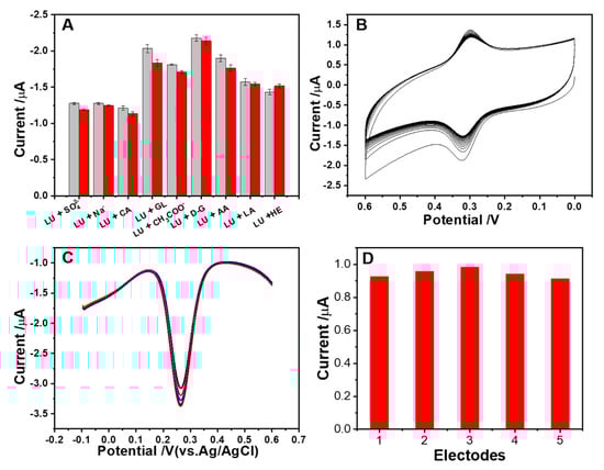 The stability test was conducted with a single electrode in 0.1 M PBS buffer solution, which was used in CV at a scan rate of 0.05 V s−1 and scan range from 0 to 0.6 V (Figure 8B). As the number of scan cycles increased, the redox peak current gradually decreased and finally reached stable after 20 cycles. For the repeatability test of UiO-66/ErGO/GCE, eight intermittent measurements were performed on 0.5 μM of LU (Figure 8C). The obtained relative standard deviation (RSD) value was 5.4%, which proved the repeatability of UiO-66/ErGO/GCE was acceptable. For the reproducibility test of UiO-66/ErGO/GCE, five electrodes prepared according to the same procedure were used to test LU in the same buffer solution. The result showed the RSD value was 2.9% (Figure 8D). Based on the properties of GO and UiO-66, the resulting modified electrode UiO-66/ErGO/GCE showed good anti-interference ability, stability, repeatability and reproducibility.