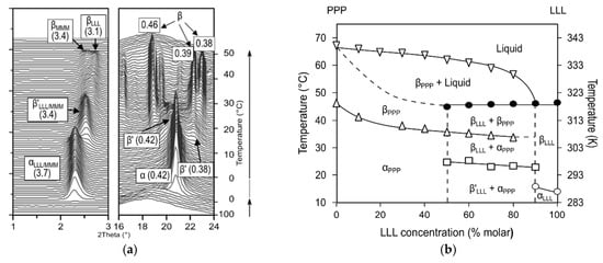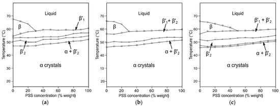 64]. In addition, the strong influence of molecular compounds on the crystallization and polymorphic transformation behavior of TAG mixtures became evident, especially in POP-rich regions of the diagrams. The α-2L→β’-2L transformation of POP through an intermediate γ-3L was hindered, and the β
