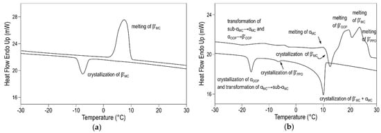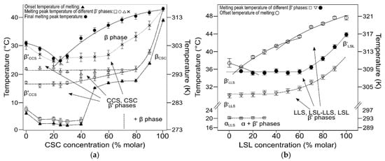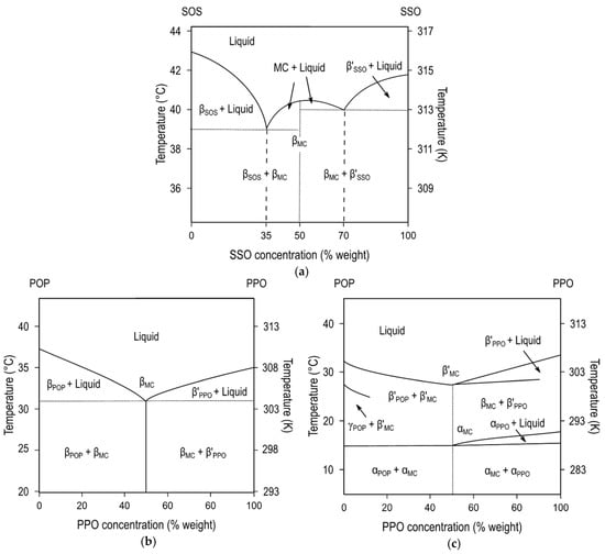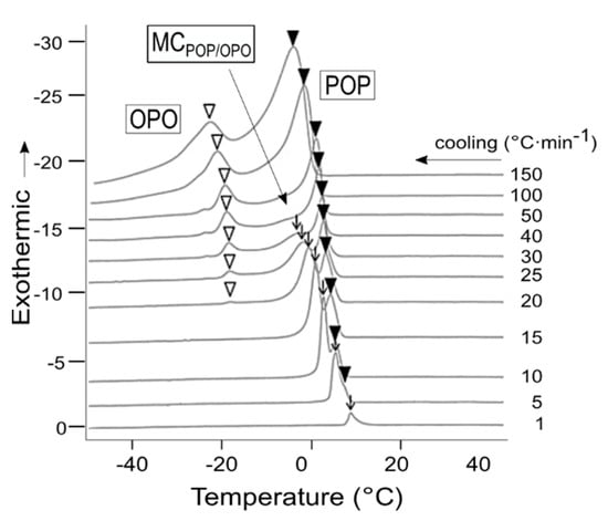128]. Overall, crystallization and melting temperatures were affected by the amount of solvent in the mixtures due to solubility effects. However, the specific interactions between TAGs were so strong that the solvent did not affect the formation of molecular compounds, even at levels up to 98%. Moreover, the single phases of molecular compound obtained during cooling the equimolecular mixture of POP/OPO at 2 °C·min