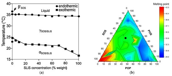 Figure 11b). The depression in melting points depicted by dark blue proved that the eutectic behavior of ternary mixtures was mainly governed by the POP/POS binary system, with the effect being particularly noticeable in the POP-rich region of the diagram. This agreed with a previous statement by Koyano et al., who pointed out the detrimental effect that POP concentration levels above those typically found in cocoa butter (denoted by a black circle in the miscible area) may have on the physical properties of lipid blends intended for being used as cocoa butter alternatives [