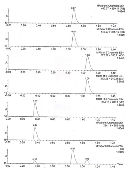 Ionization mode selection is another optimization parameter and is used for the selection of parent ions, where ESI+ or ESI− is checked and selected based on the sensitivity and the chemical ionization characteristics of the analytes. The mass-to-charge ratio (m/z) of the parent ion of the individual analytes, i.e., methylene blue, rhodamine B and crystal violet, was confirmed by infusion of the combined sample of 1000 ng mL−1 through the syringe pump to the mass spectrometer. The obtained results suggest that methylene blue, rhodamine B and crystal violet form the [M+H]+ parent ion under ESI+ mode. The details of the MS and the analyzer parameters are given in Table 1, while the details of parent ion and the resulting daughter ions are given in Table 2. The Multiple reaction monitoring (MRM) chromatograms of the three dyes are presented in Figure 1.