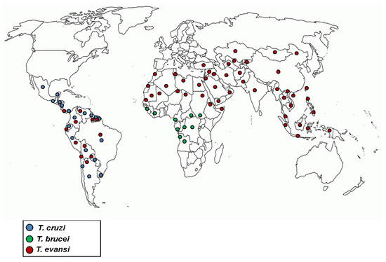 Trypanosomiases are insect-borne parasitic diseases of humans and animals caused by flagellate protozoans of the genus Trypanosoma. Occurring mainly in Latin America and Africa, where they are considered endemic, and they are of great importance to human health [1,2]. According to Britannica Academic [3], the life cycle of trypanosomes includes one stage in the blood or tissue of a vertebrate host and another stage in an invertebrate vector. Furthermore, approximately 20 Trypanosoma species are known, but only two species cause disease in humans, Trypanosoma cruzi and Trypanosoma brucei. T. cruzi is the cause of American trypanosomiasis, also called Chagas disease, which is prevalent throughout the Americas. It is spread by Triatominae insects, commonly called “kissing bugs”. In the bloodstream, the parasite multiplies and can reach the heart, liver and spleen, where it can cause extensive damage. T. brucei is responsible for African trypanosomiasis or sleeping sickness, most commonly found in equatorial Africa. Human African trypanosomiasis takes two forms depending on the parasite involved, which are both transmitted by tsetse flies (Glossina spp.). Sleeping sickness in eastern and southern sub-Saharan Africa is an acute form caused by the subspecies T. brucei rhodesiense. Trypanosomiasis in the central and western regions of Africa is a slow-progressing form caused by T. brucei gambiense. Both trypanosomes invade the brain, causing mental deterioration, coma and death if left untreated [4,5]. There is also Surra, which is a trypanosomiasis caused by T. evansi, that affects wild and domestic animals mainly in Africa, Asia and South America, causing serious economic losses due to mortality and morbidity [6]. However, despite being a disease that predominantly affects animals, cases of surra have been reported in humans in the Asian region, where the main symptoms observed were fever and drowsiness, without invasion of the parasite in the central nervous system [7]. Figure 1 illustrates the worldwide distribution of the main species causing human trypanosomiasis.