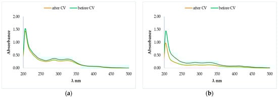 Figure 7 shows that the UV bands of basil extracts before and after CV analysis overlap. The characteristic wavelengths of each UV-Vis spectrum proved the presence of flavonoidic compounds in the analyzed extracts. The presence of naringin in the Romanian basil hybrid extracts was confirmed by HPLC-DAD quantification using naringin as standard and it was observed in both Romanian basil varieties, with a λmax at 228 nm and other characteristic signals in the range of 250~320 nm [27,28].