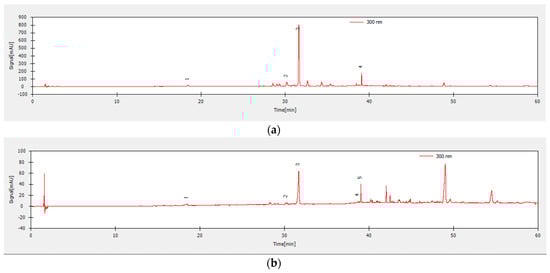The HPLC-DAD (high-Performance Liquid Chromatography with Diode-Array Detector) analysis was carried out using a High-Performance Liquid Chromatography Systems L-3000 (RIGOL TECHNOLOGIES, INC Beijing, China). In the chromatographic analysis, the Kinetex EVO C18 (150 4.6 mm, particle size of 5 µm) column was used with an injection volume of 10 µL. The solvents used were (A) 0.1% trifluoroacetic acid (TFA) in water and (B) 0.1% trifluoroacetic acid (TFA) in acetonitrile. The gradient elution was from 2% to 100% B at 30 °C for 60 min, and the elution flow was set at 1000 µL/min. Further, 300 nm analytical wavelength was used for detection in accordance with the literature [42].