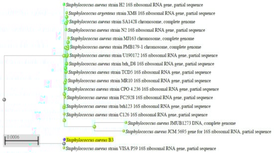 The nucleotide sequence of 16S rRNA gene of the S. aureus LC 554891genome was sequenced by using 3130 X DNA Sequencer (Genetic Analyzer, Applied Biosystems, Hitachi, Ibaraki, Japan) as described previously [55,56]. The way to record such strain in gene bank included the submission of the sequence of 16 S rRNA gene of the B3 genome to Gene Bank at http://blast.ncbi.nlm.nih.gov/Blast.cgi?PROGRAM=blastn&PAGE_TYPE=BlastSearch&LINK_LOC=blasthome. By using the Basic Local Alignment Search Tool Program, a phylogenic tree and cluster analysis were carried out by clusta 1× Program for estimation of the similarity between the isolated strains and the stored S. aureus strains in the database. It was shown clearly that the B3 strain is similar by ˃ 99.5% to S. aureus category (Figure 2). An accession Number LC554891 on the NCBI web server (http://blast.ncbi.nlm.nih.gov/Blast.cgi?PROGRAM=blastn&PAGE_TYPE=BlastSearch&LINK_LOC=blasthome) of such strain was given as a record code for this strain. Consequently, such strain was designated as S. aureus LC554891. By using the Basic Local Alignment Search Tool Program, a phylogenic tree and cluster analysis were carried out by clusta 1× Program for estimation of the similarity between the isolated strains and the stored S. aureus strains in the database.