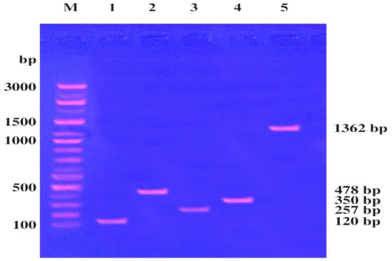 Detection of S. aureus B3 virulence factors in two multiplex PCR reactions; DNA marker (M), sea (1), seb (2), sec (3), tsst-1 (4), and fnbA (5).