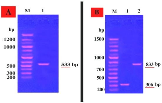 Agarose gel electrophoresis of both mecA, hla, and hlb genes. (A) mecA gene, Lane M, marker DNA of known molecular sizes; Lane (1) PCR product of mec A gene. (B) hla and hlb genes; Lane M, marker DNA of known molecular sizes; Lane (1) PCR products of hla gene, Lane (2) PCR products of the hlb gene.