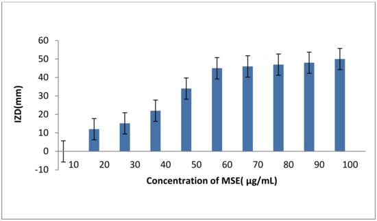 A stock prepared MSE contained 200 µg/mL. From this MSE concentration, different dilutions were made to contain 10, 20, 30, 40, 50, 60, 70, 80, and 90, µg/mL, respectively. Serial two-fold dilutions of MSE were made in sterile deionized water by taking 0.05, 0.1, 0.15, 0.2, 0.25, 0.3, 0.35, 0.4, and 0.45 mL, from the original stock and this equals 10, 20, 30, 40, 50, 60, 70, 80, 90 µg/mL, respectively. Then, sterile filter paper discs were saturated with the MSE dilutions and placed onto Muller Hinton agar (DifcoTM, Maryland, MD, USA) that seeded previously with activity growing cells of S. aureus B3. The antibacterial activity was studied by a disc diffusion assay as described above. MIC was visually identified as the lowest concentration of MSE that inhibited bacterial growth [9,10,11,40].