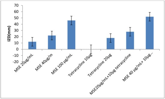 The inhibitory effect of MLE, MSE and HB against S. aureus LC 554891 is given in (Table 3) and Supplementary Figure S2. MSE showed the higher inhibitory activity as inhibition zone diameters (IZDs) against S. aureus LC 554891 reached 47–50 mm, while inhibitory activity of either MLE or BH was rather low as IZDs reached up to 15 mm of MLE ethanol extract (EE) and up to 34 mm of 100% HB (Table 3). Water showed the best extraction solvent than either ethanol or methanol as IZDs obtained against S. aureus by MSE water extract (WE) reached 34–50 mm and were up to 0–10 mm; 0–18 mm by MSE (EE); MSE methanol extract (ME), respectively. Since MSE showed the best inhibitory activity against S. aureus LC 554891, its MIC value was carried out by a disc diffusion assay using Muller Hinton agar. As given in Figure 5, the MIC value of MSE was 20 µg/mL. The inhibition of the MDR S. aureus LC 554891 bacterium by MSE in this investigation is very important, and its inhibition by a natural agent either singly or in combination with antibiotics is very promising. Hence, results were further examined to check the effect of combinations of the antibiotic tetracycline with MSE. The data given in Figure 6 showed that mixing of the MIC value of MSE with 10 µg tetracycline inhibited S. aureus LC 554891 distinctively. Doubling the values of MIC of MSE with the same concentration of the antibiotic tetracycline showed wider inhibition of S. aureus LC 554891 that obtained by either MSE or tetracycline only.