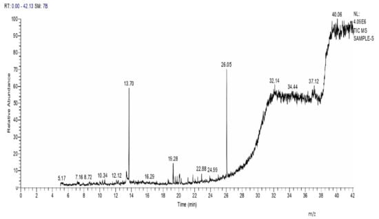 To determine and identify the bioactive compounds of MSE, Gas Chromatography–Mass Spectroscopic (GC-MS) was used (Trace GC 1310-ISQ Mass Spectrometer, Thermo Scientific, Austin, TX, USA). A direct capillary column TG–5MS (30 m × 0.25 mm × 0.25 µm film thickness) was used. About 3 µL of MSE was injected automatically to the equipment using Auto sampler AS3000 coupled with GC in the split less mode. Then, the instrumental analysis was carried out as described previously [15,65]. The components were identified by comparison of their retention times and mass spectra with those of WILEY 09 and NIST 11 mass spectral database [66].