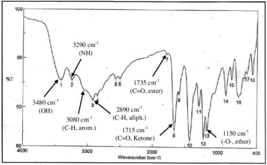 The IR-spectra (Figure 8) of MSE showed the presence of bands at 3480, 3290 cm−1 for OH and NH, 3080, 2890 cm−1 for C-H aliphatic and aromatic and at 1735, 1715 cm−1 C=O for ester and ketone, in addition a band at 1150 cm−1 was characterized for the -O-ester group.