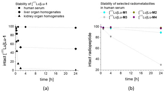 Stability of (a) [177Lu]Lu-1 after incubation in human serum as well as in rat liver and rat kidney homogenates, and of (b) selected radiolabeled metabolites M1–M4 in human serum, as analyzed up to 24 h after incubation.