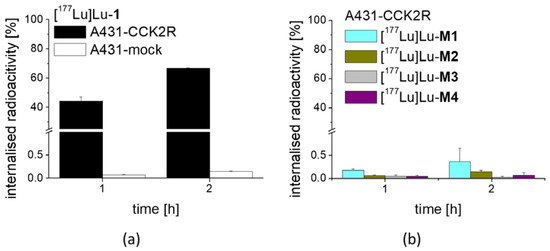 Cell uptake of (a) [177Lu]Lu-1 in A431-CCK2R and A431-mock cells and (b) 177Lu-labeled M1–M4 in A431-CCK2R cells, after 1 h and 2 h incubation.