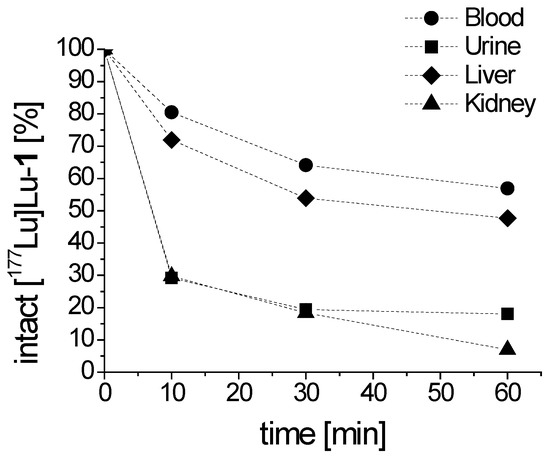 Intact [177Lu]Lu-1 detectable in blood and urine, as well as liver and kidney homogenates obtained from BALB/c mice, as analyzed up to 60 min p.i.